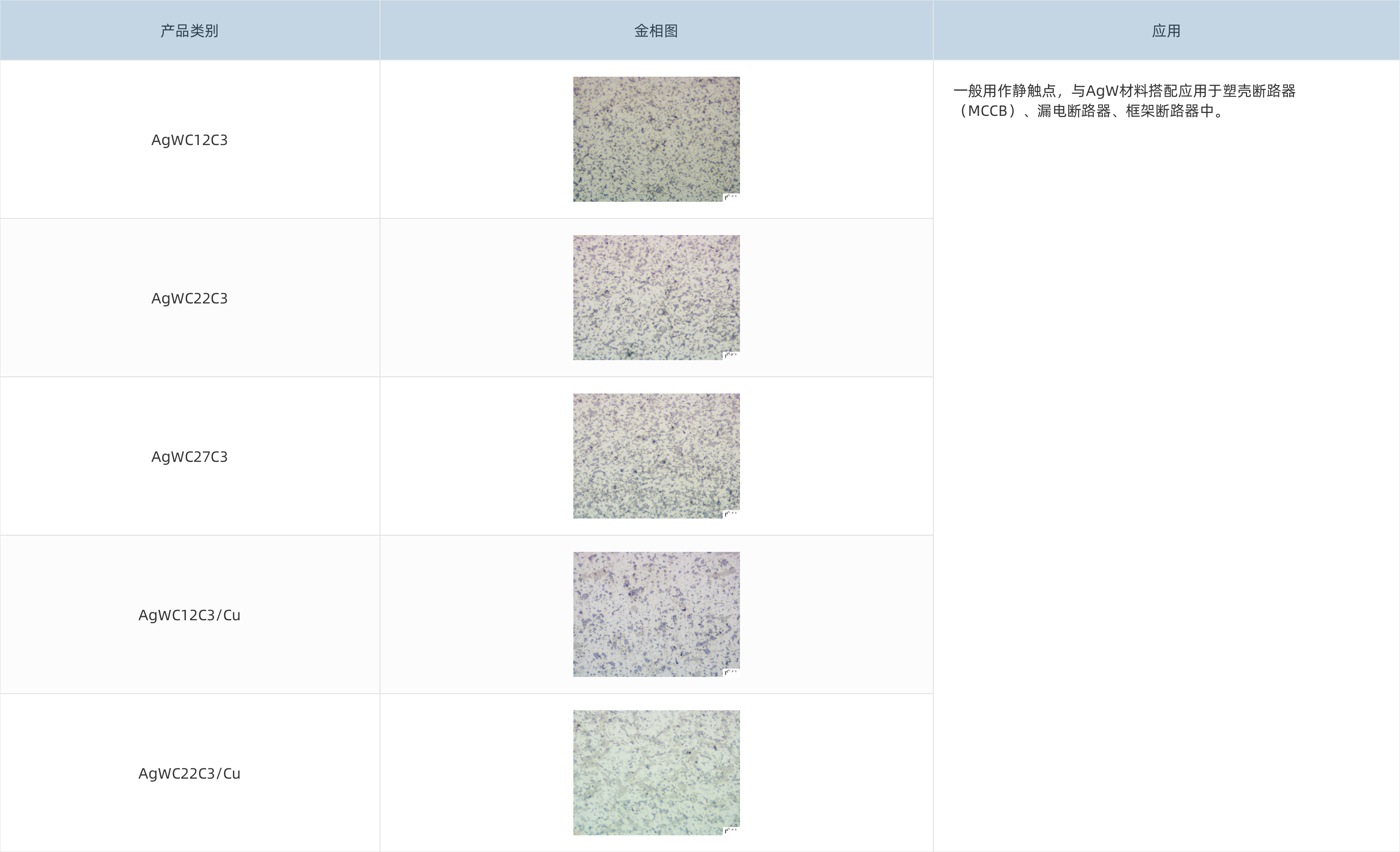 AgWCC觸點采用粉末固相燒結法制備,產品銀含量較高,硬度較低,具有較低的接觸電阻,第三相即石墨的加入提高了材料的抗熔焊性和潤滑性,一般用作靜觸點材料,與其他材料配對使用。
